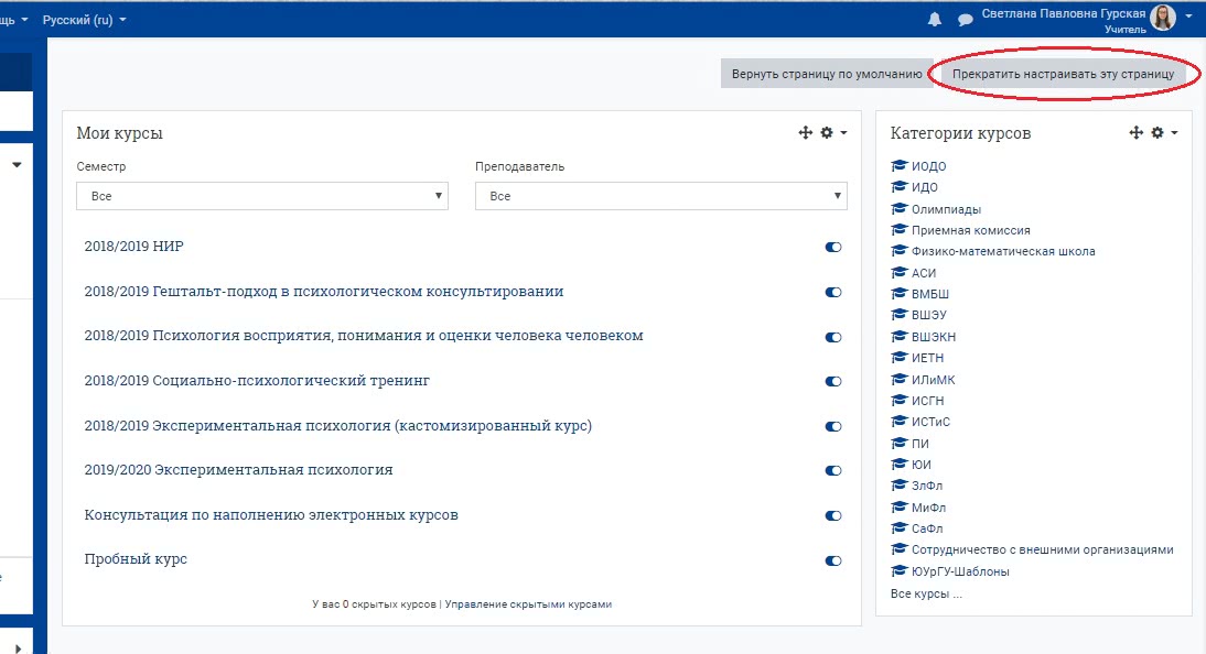 - После внесенных изменений в верхнем правом углу нажмите на кнопку «Прекратить настраивать эту страницу».