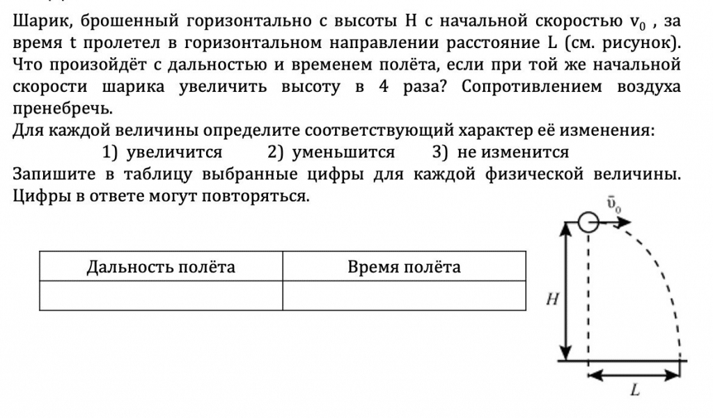 Начнем со времени. Представим, что вы кидаете мячик параллельно полу с высоты колена, а потом поднимаетесь на 25 этаж своего дома и кидаете его с крыши. Будет ли он дольше лететь? Конечно, поэтому смело пишем, что время полета увеличится.