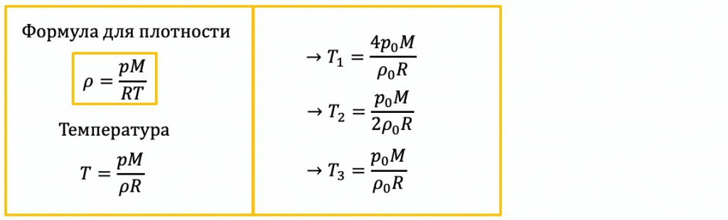 Запишем формулу для плотности, где M – молярная масса газа. Выразим температуру и применим ее для описания каждой точки графика.