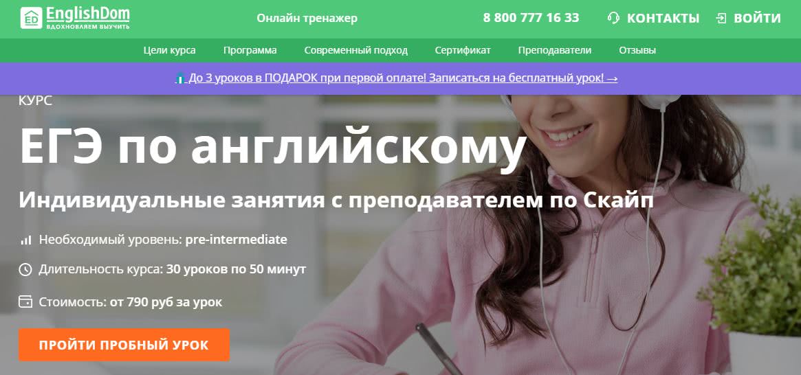 Здесь занятия проводятся по скайпу. Один курс состоит из 30 уроков. Длительность одного занятия 50 минут, а его минимальная цена – 790 руб. Однако школа требует минимальный уровень Pre-Intermediate.