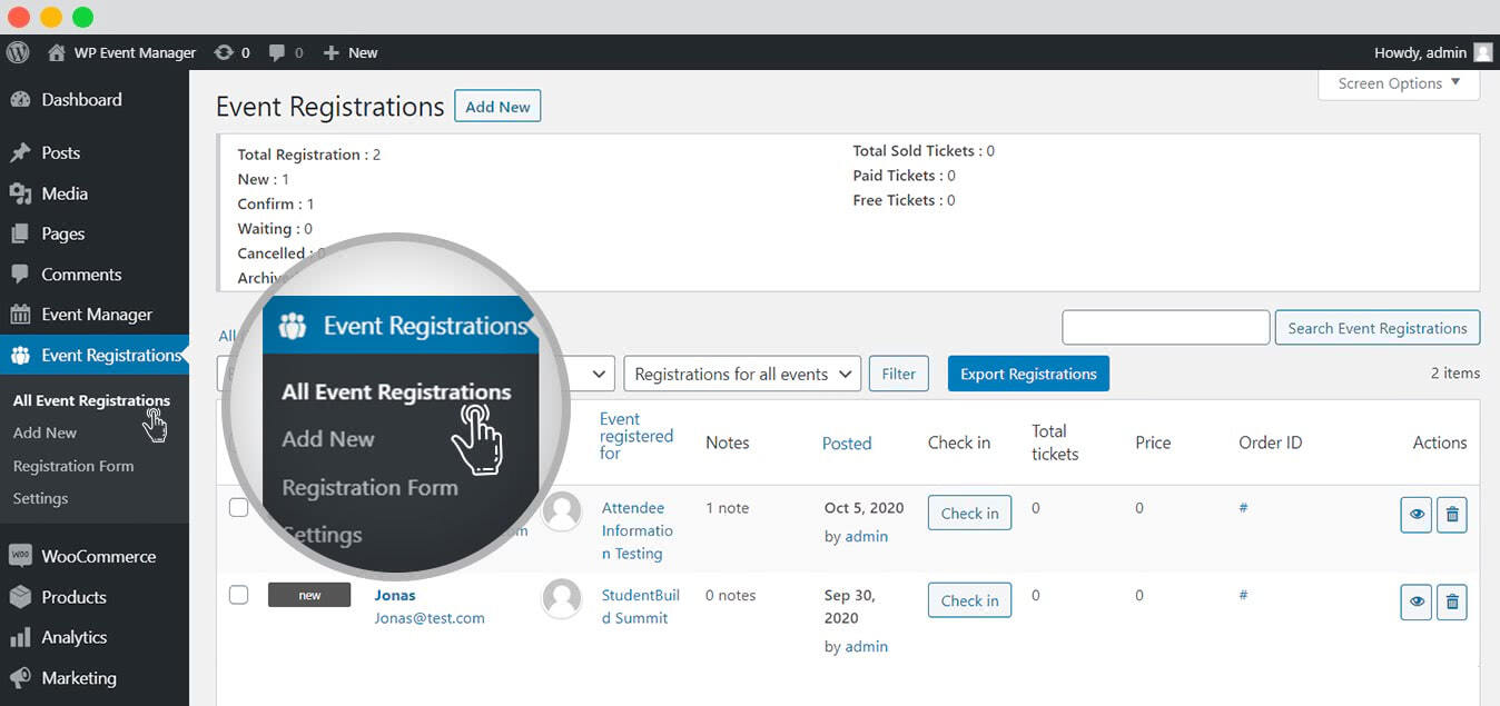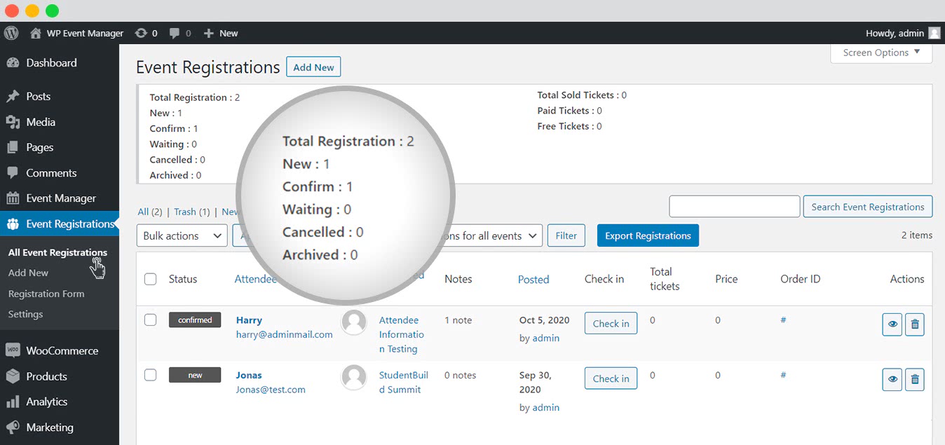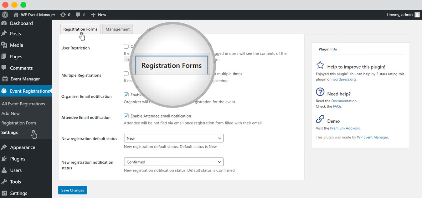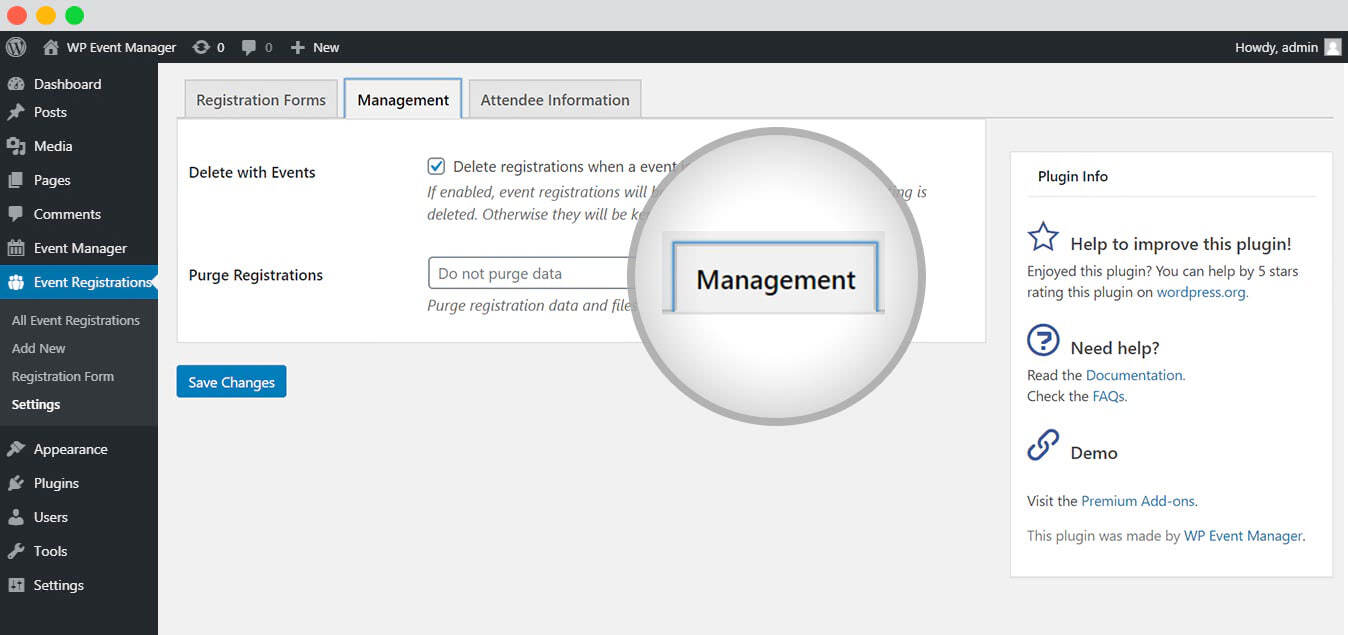 - Go to WP-admin >> Event Registrations >> Settings >> Management:
