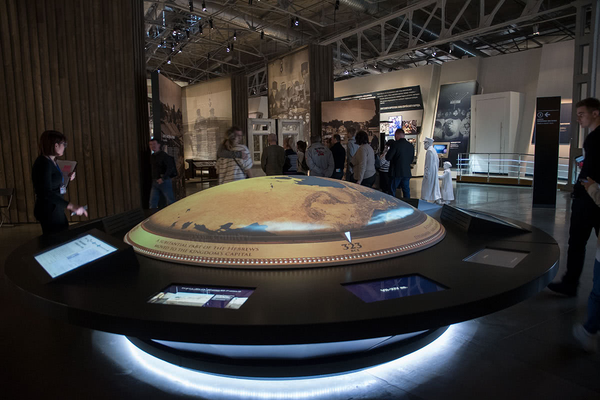 Геометрическим и смысловым центром исторической экспозиции Еврейский музей сделал макет части земного шара, и не без оснований. На глобусе отмечены пути миграции еврейского народа, как они изложены в священных книгах древнейшей человеческой религии. На окружности столешницы содержится хронологическая шкала с датами крупнейших событий в жизни евреев, их продолжительных скитаниях и расселении по миру. При этом желающие могут узнать сведения о евреях в любом регионе мира.