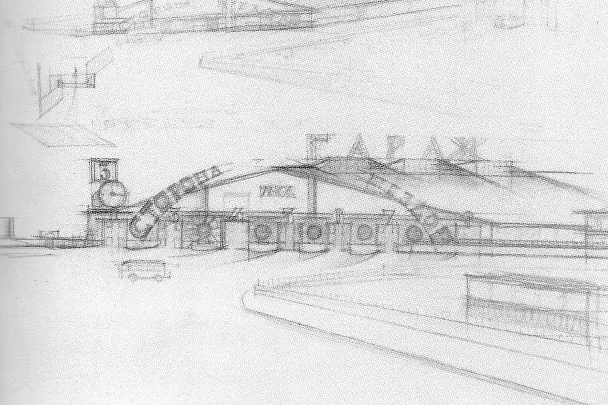 Один из первоначальных эскизов Бахметьевского гаража, 1926-1927