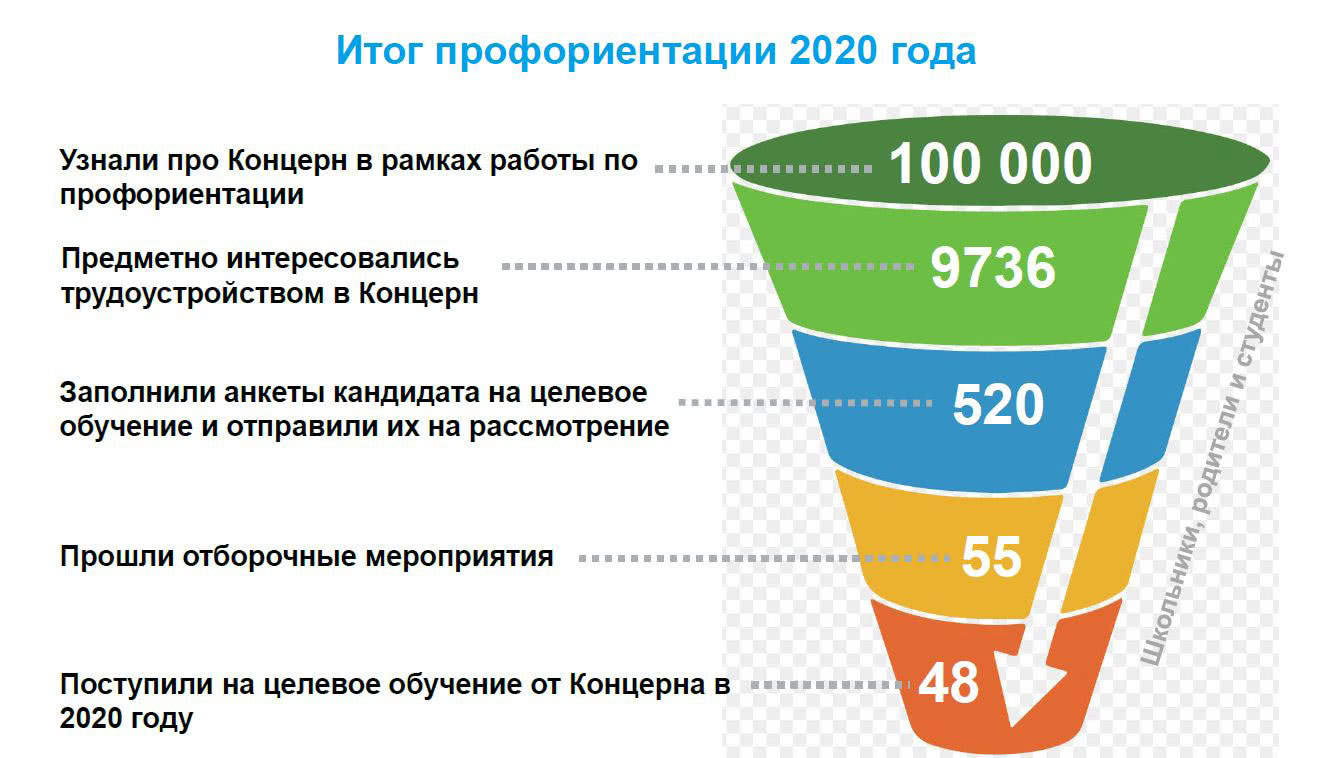 Масштабом этой работы можно и нужно восхищаться. Однако цифры, приведённые на слайде, наверняка погрузят в долгую депрессию руководство чуть менее крупных компаний. В 2020 году на целевое обучение от Концерна «Алмаз-Антей» поступили 48 человек (все ли устроятся работать в соответствии с договором, ещё вопрос), но для этого пришлось вовлечь в информационные мероприятия 100 тысяч человек – молодых людей и их родителей. Такая возможность есть, мягко говоря, далеко не у каждого предприятия.