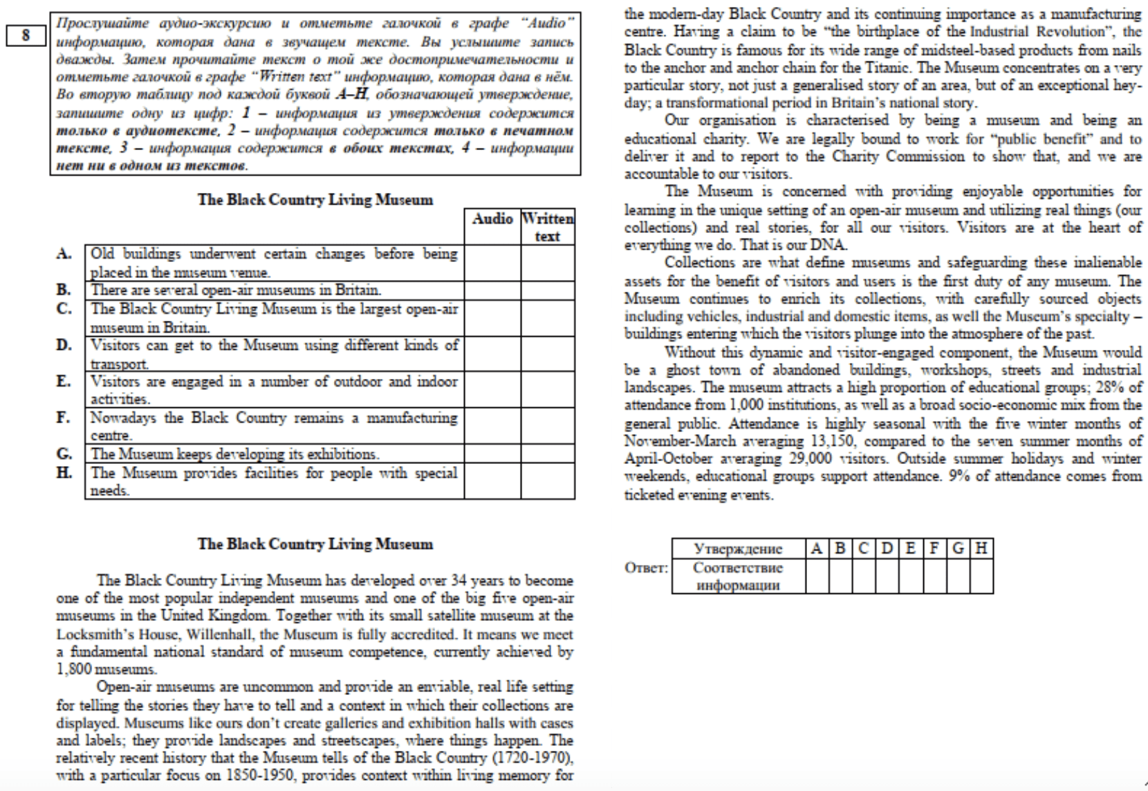 В этом задании высокой сложности аудирование взаимосвязано с чтением – учащиеся слушают аудиозапись, а потом читают связанный с темой текст. Далее им необходимо выбрать, где упоминалась та или иная информация – в аудио или печатном тексте.