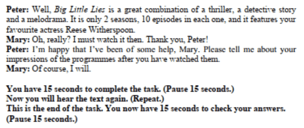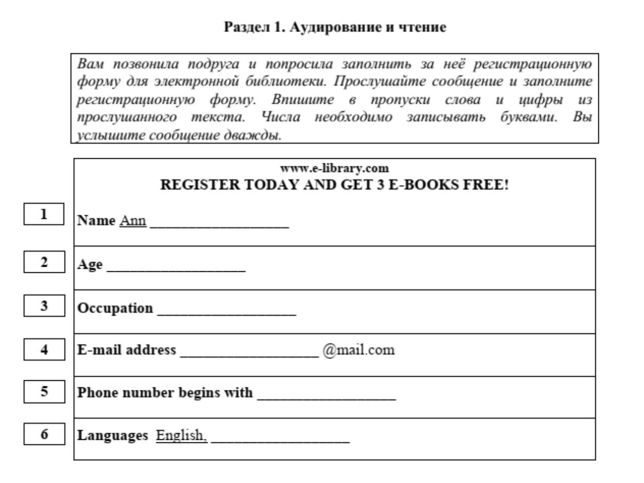Это задание базового уровня. Здесь предполагается прослушивание текста два раза и заполнение пропусков необходимой информацией. Необходимо вписать слово, если нужно число, его нужно написать буквами. Слова нужно вписывать без каких-либо изменений. Ниже можно ознакомиться со скриптом к данному заданию.