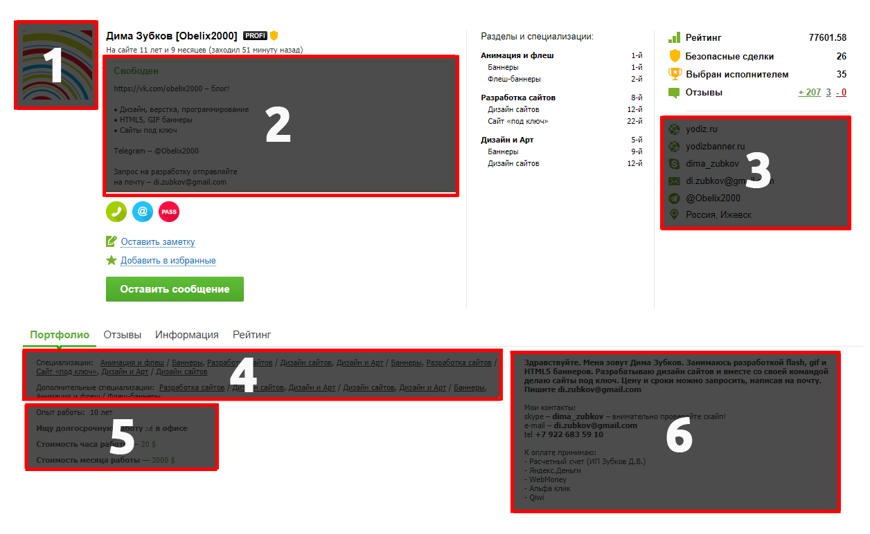 Профиль фрилансеры наполняют разнообразной важной информацией о себе. Наиболее популярные блоки, из которых строится профиль: