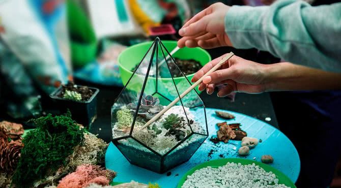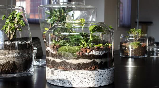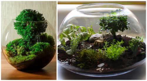 Растительный террариум оснащен с боковой стенки или верхней части узким отверстием, предназначенным для циркуляции воздуха и создания микроклимата внутри банки или вазы. Для создания необычного мини-сада используют как специальные контейнеры для выращивания диковинных цветов и кустарников, так и лейки, стеклянные банки, вазы, бутыли, чаши, чайники, которые можно найти у себя дома.