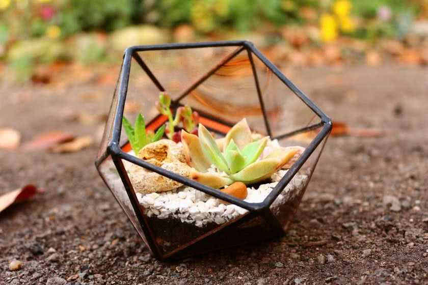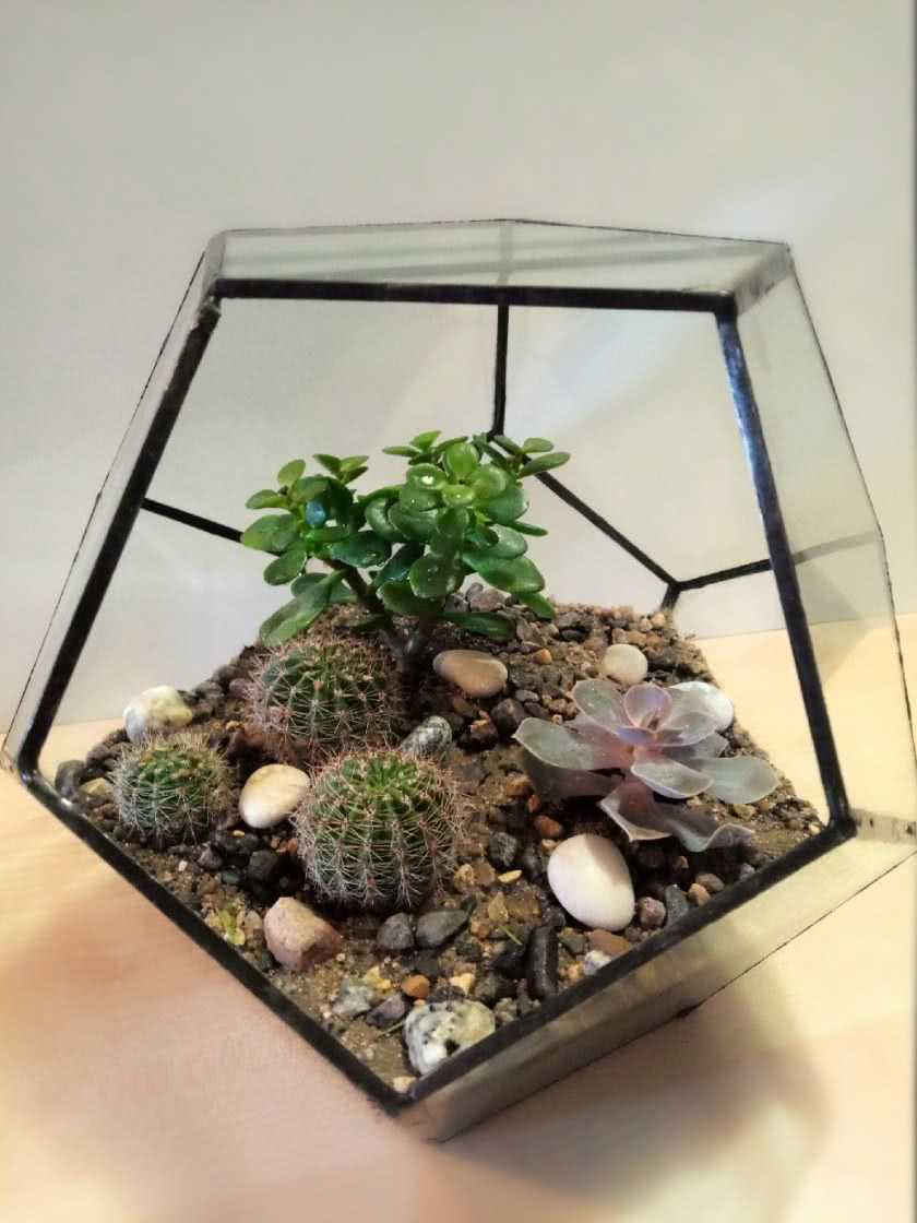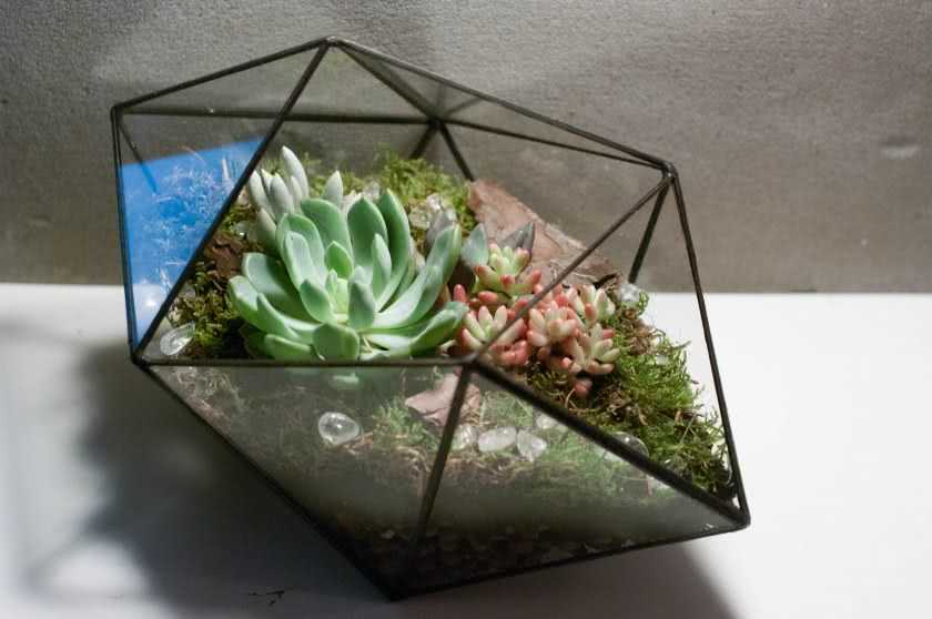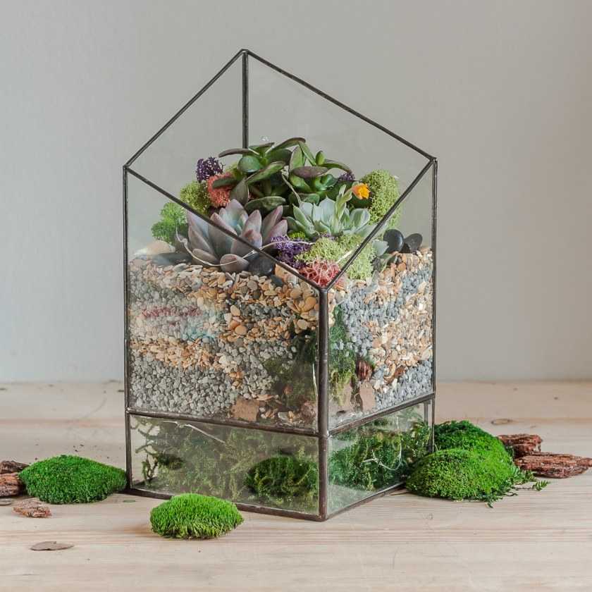 Можно купить готовую или поискать дома и приспособить то, что есть в наличии, – банки, бокалы, бутылки, чайники и вазы. Готовые флорариумы можно найти практически любой формы – куб, сфера, полусфера, конус, цилиндр, купол, но наиболее популярны геометрические флорариумы.