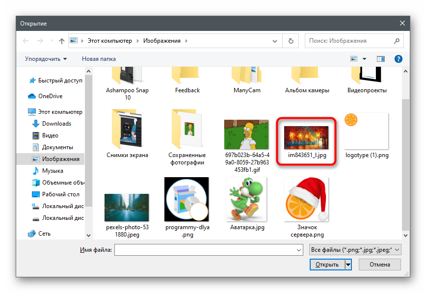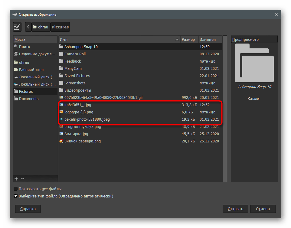 В новом окне «Открыть изображение» найдите картинки для объединения, выделите их и подтвердите добавление.
