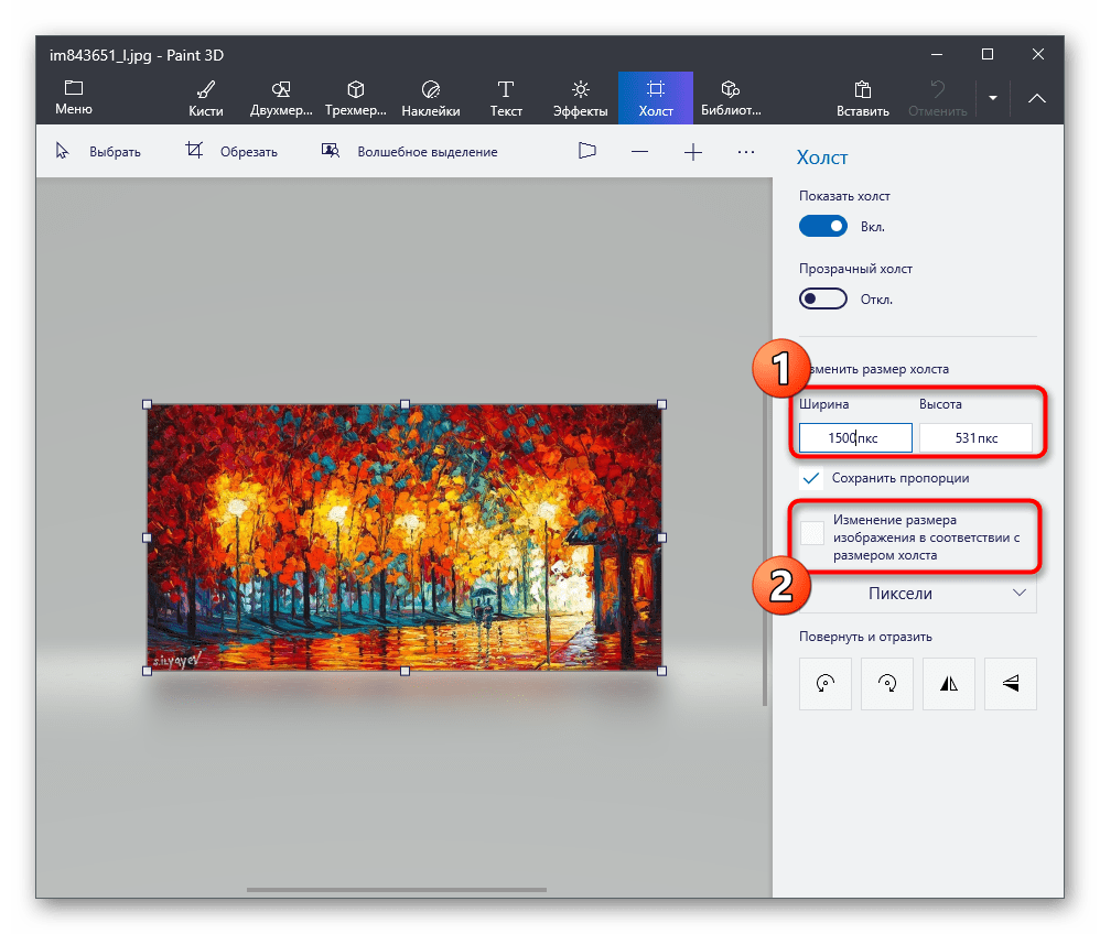 Увеличьте размер холста так, чтобы другое изображение тоже поместилось при соединении (этот параметр можно менять в любой момент). Обязательно снимите галочку с пункта «Изменение размера изображения в соответствии с размером холста».