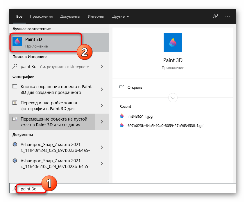 - Откройте меню «Пуск» и через поиск найдите приложение «Paint 3D».
