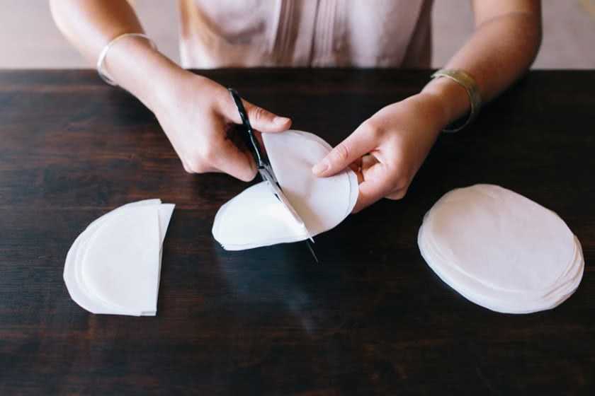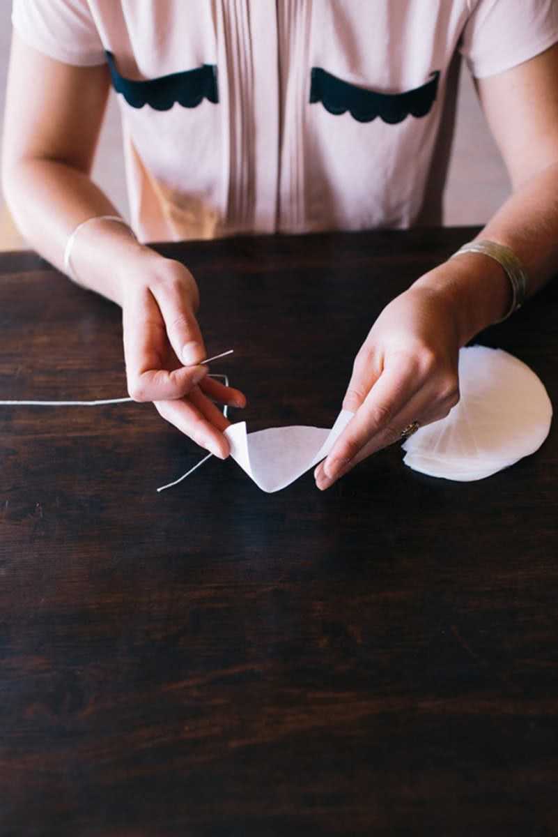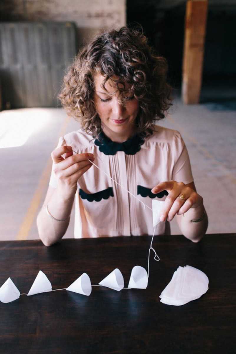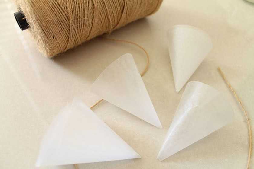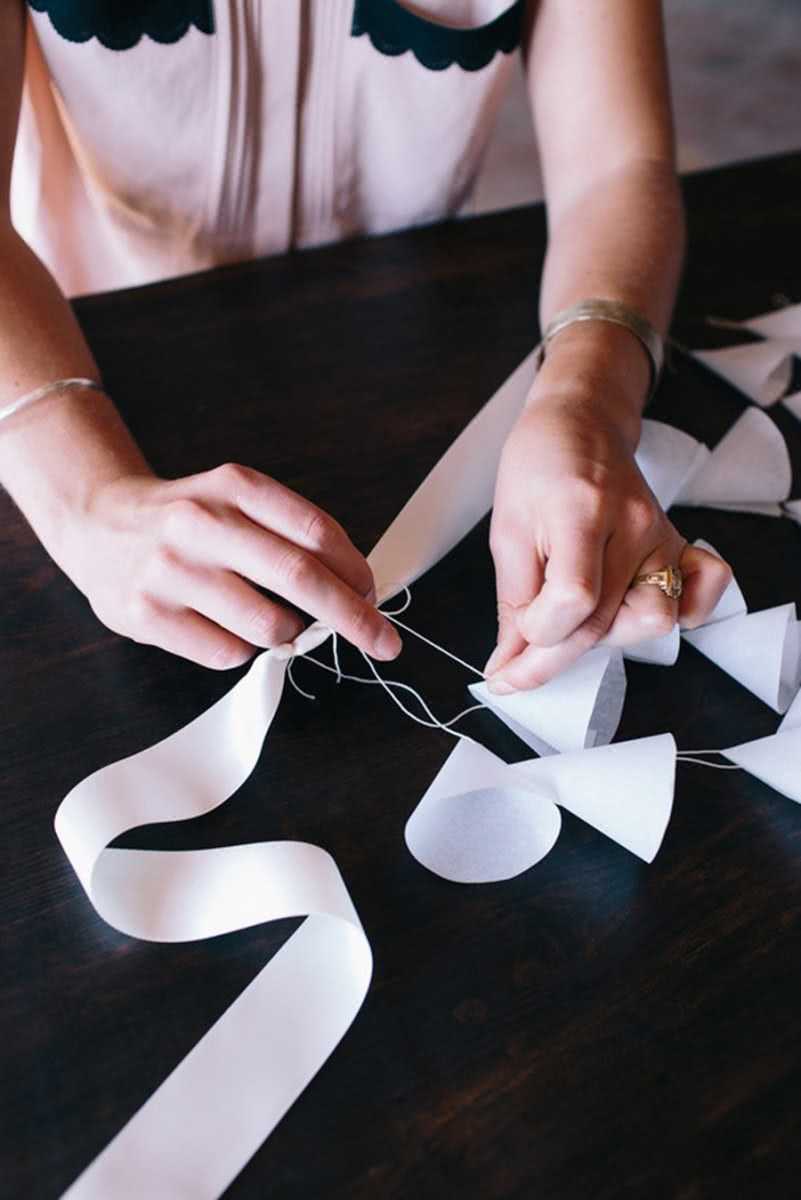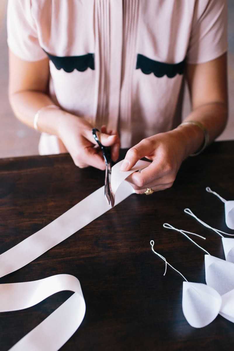 Для изготовления потребуются: атласная лента (от 10 метров), пергаментная бумага, игла с ниткой, ножницы и клей. На первом шаге вырезаются бумажные полукруги. Затем они сворачиваются конусом и закрепляются клеем. После чего готовые заготовки нанизываются на нить на расстоянии около двух сантиметров друг от друга.