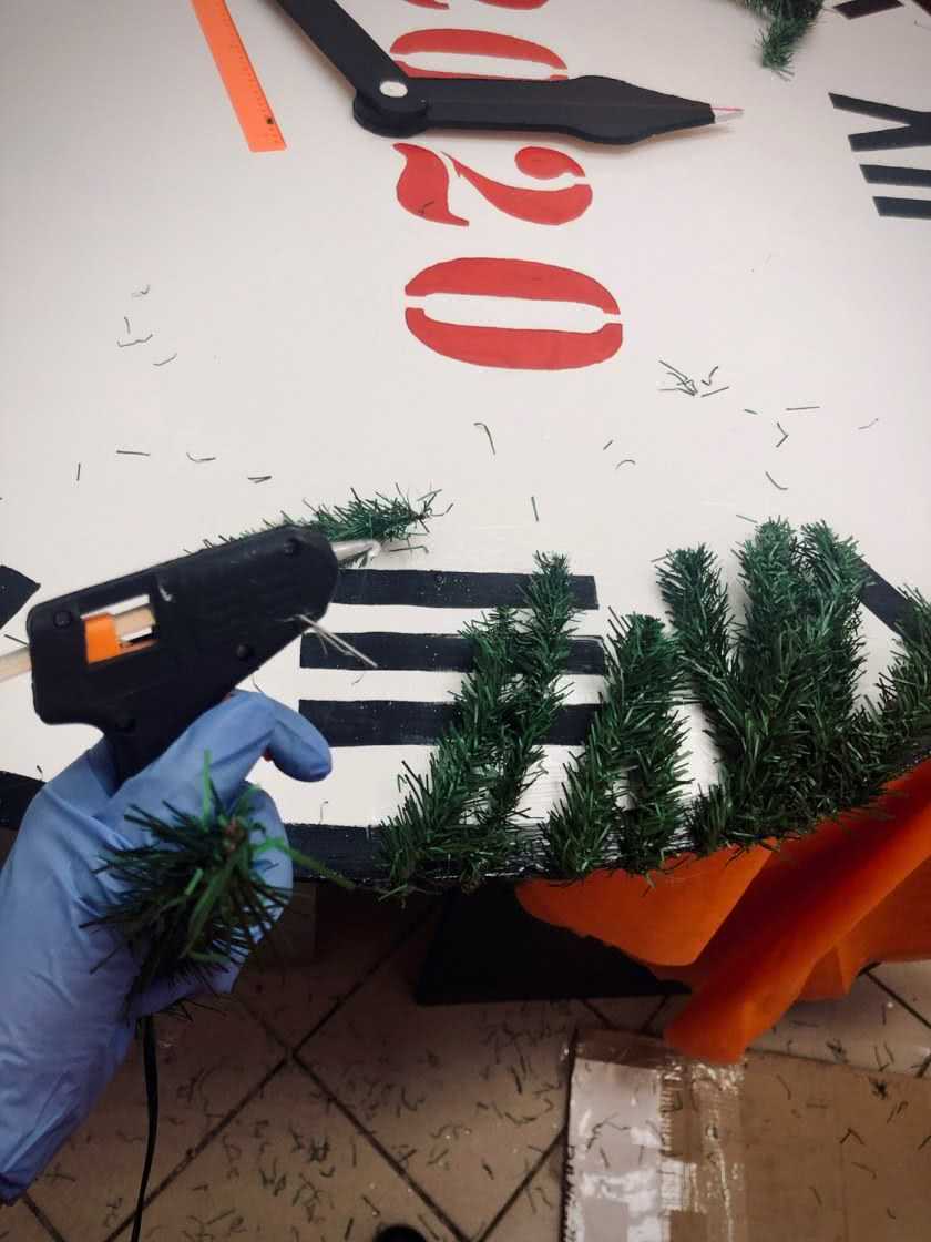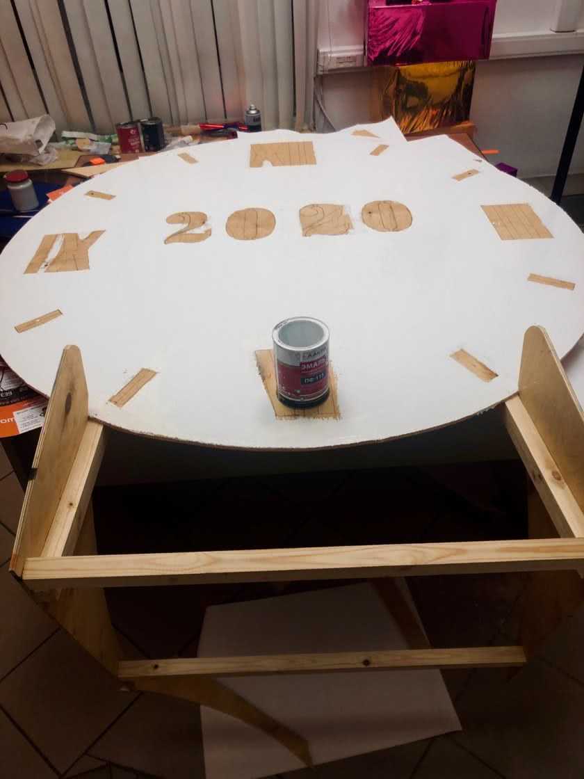 Нужно продумать опору для каркаса, ведь объемная гирлянда из шаров к стене будет плохо крепиться, поэтому лист ДСП можно укрепить к спинке стула, вешалке для одежды или подставке для новогодней елки.