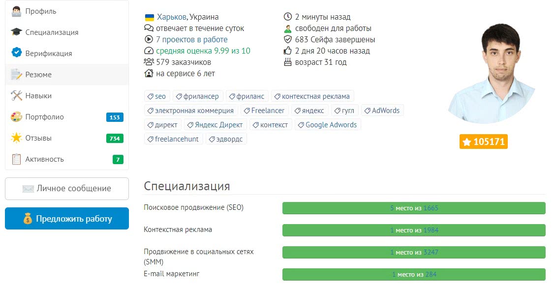 Так выглядит профиль фрилансера: есть средняя оценка, навыки, специализации.