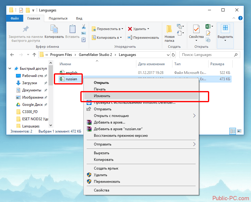 После того как скачали файл русского языка, копируем его и вставляем в директорию с Платформой в папку «Languages» которая лежит по следующему пути C:\Program Files\GameMaker Studio 2\Languages