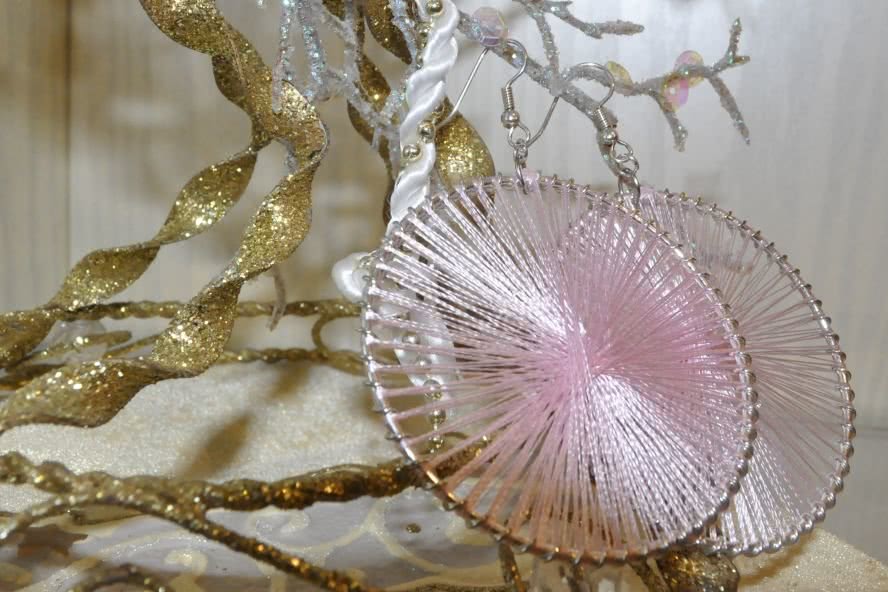 Сережки также необязательно обматывать слишком плотно. Это, кстати, во многом зависит и от толщины самой нитки. А в качестве декора можно использовать различные подвески, которые продаются в магазинах для хенд-мейда.