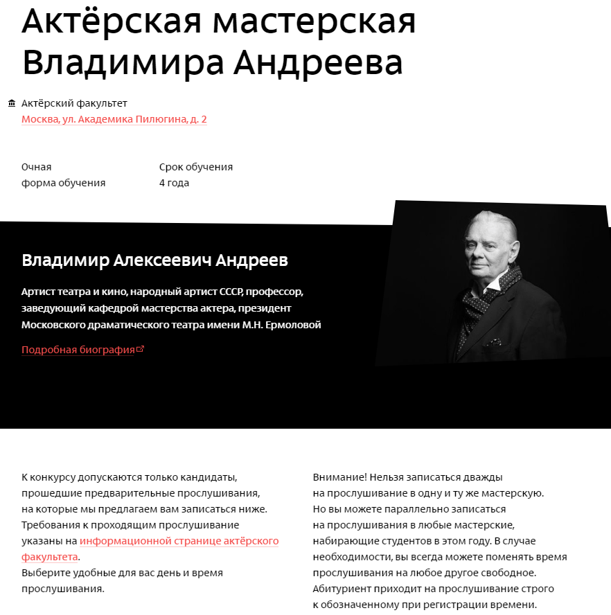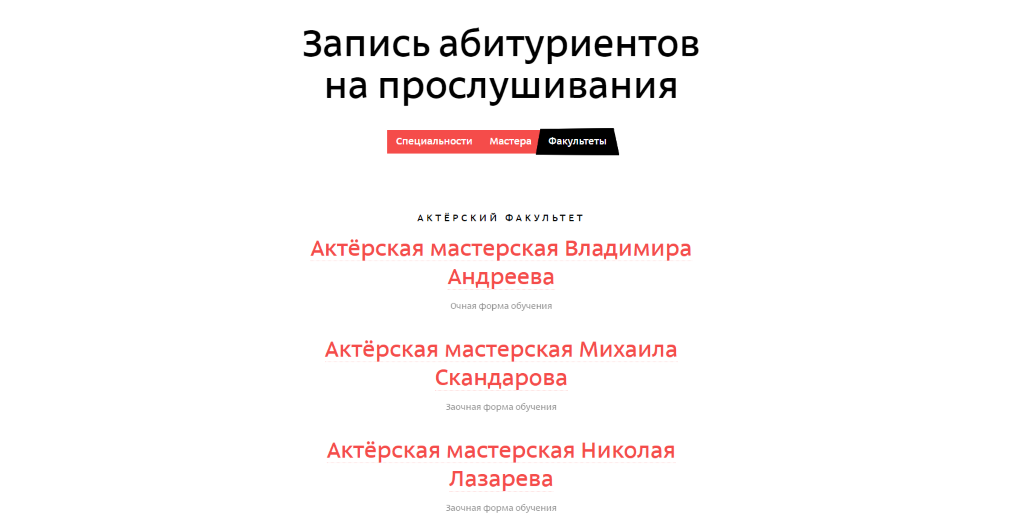 Для поступления на актерский факультет на очную форму запишитесь на прослушивание в актерскую мастерскую Владимира Андреева, на заочную — в актерскую мастерскую Михаила Скандарова или Николая Лазарева.