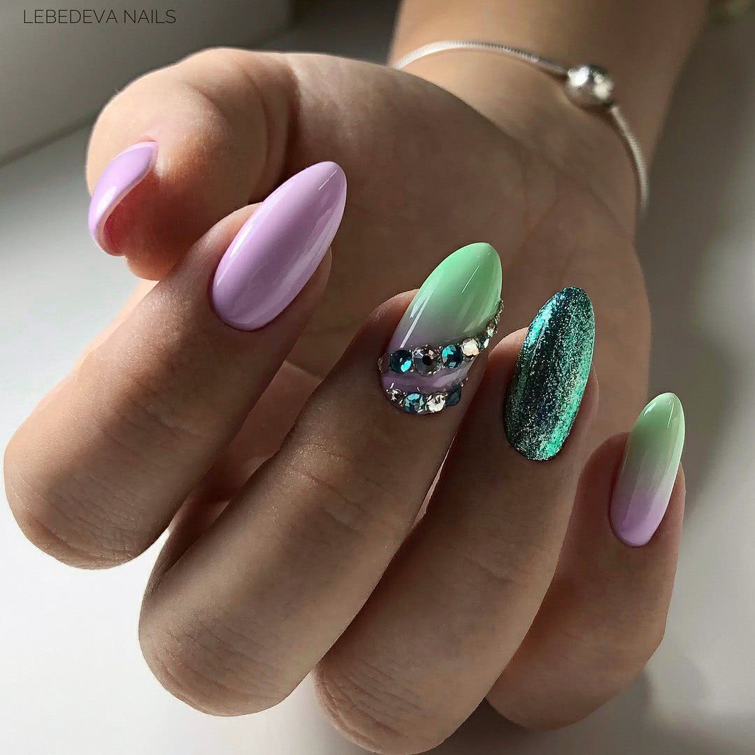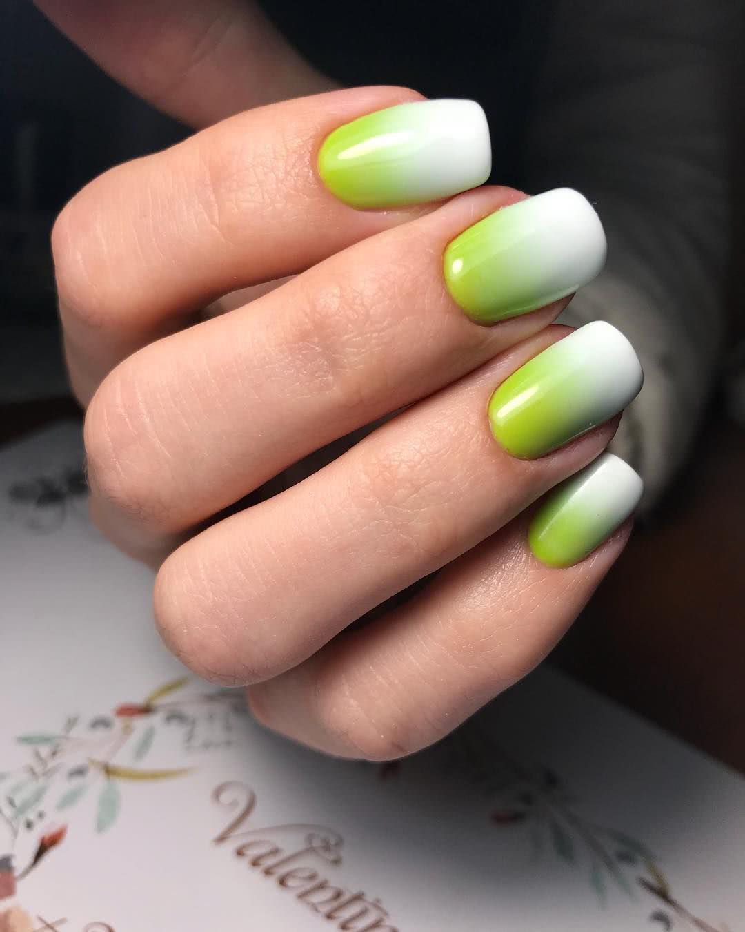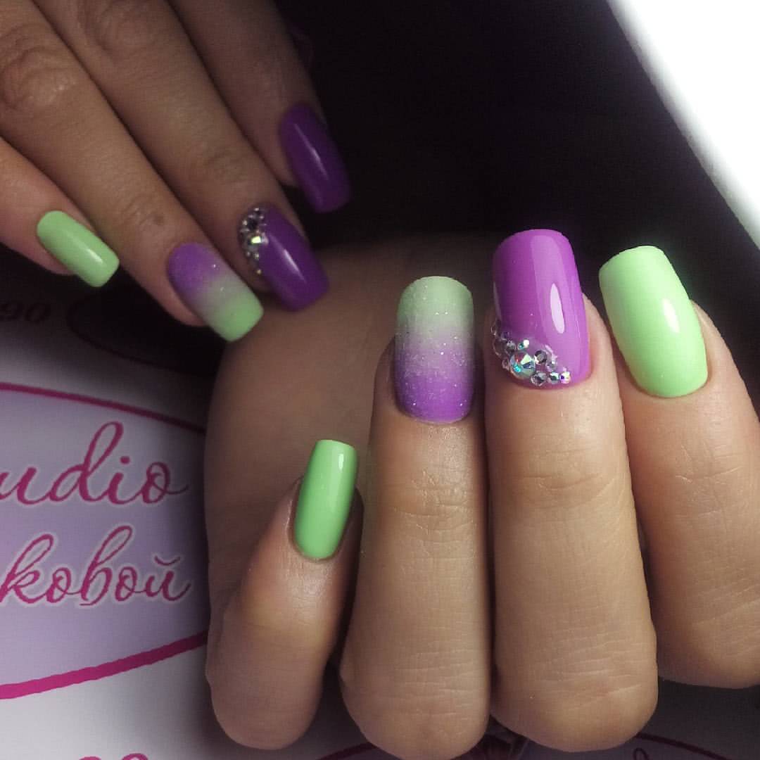 Нежные оттенки зеленого подойдут для романтических утонченных натур. А если выбрать яркие тона этого цвета, то такой градиентный маникюр будет подчеркивать экстравагантность и эмоциональную легкость его обладательницы. Нежные оттенки зеленого более актуальны в весеннее время, а яркие и пестрые – в летнее.