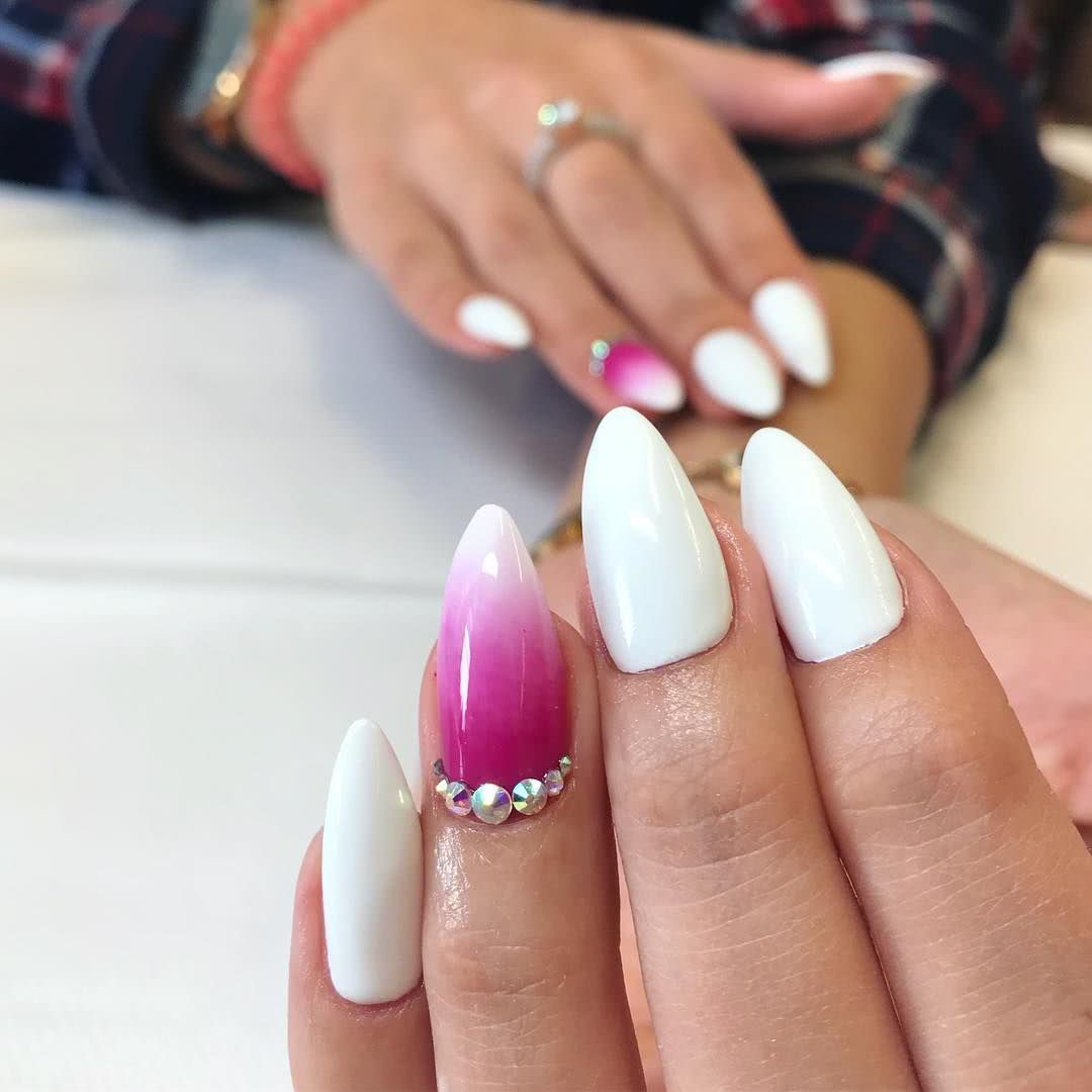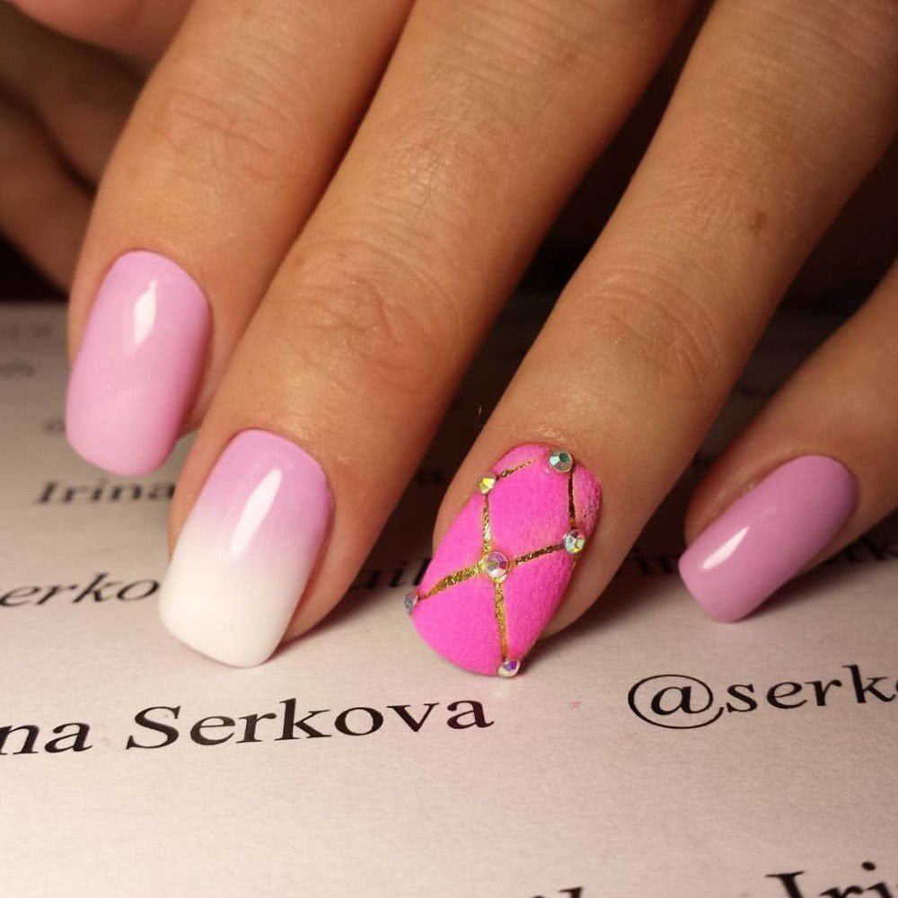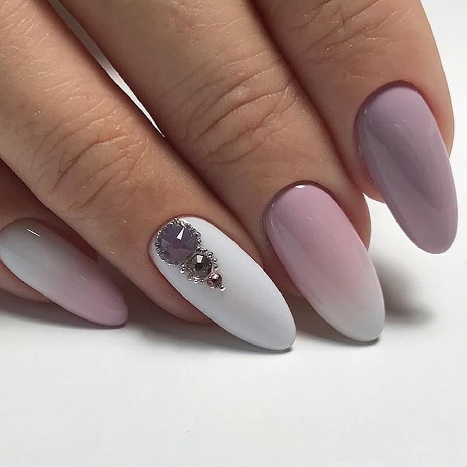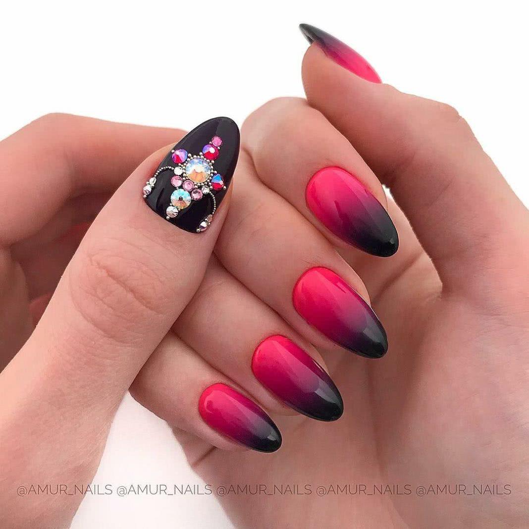 Если Вам нужен запоминающийся дизайн, то градиент с глиттером и стразами как никакой другой подойдут Вам. Его «фишка» заключается в особом декорировании ногтей – при помощи страз.