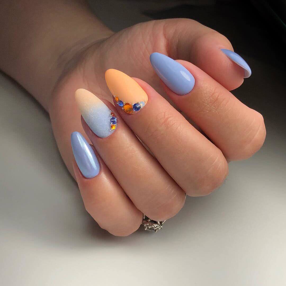 Оранжевый градиент, сиреневый, зеленый, фиолетовый, персиковый, серый, вертикальный, геометрический с ромбиками, с рисунками, с лунным дизайном,губкой, кистью или аэрографом – пришло время поговорить о самых модных идеях омбре и оценить этот маникюр на фото.