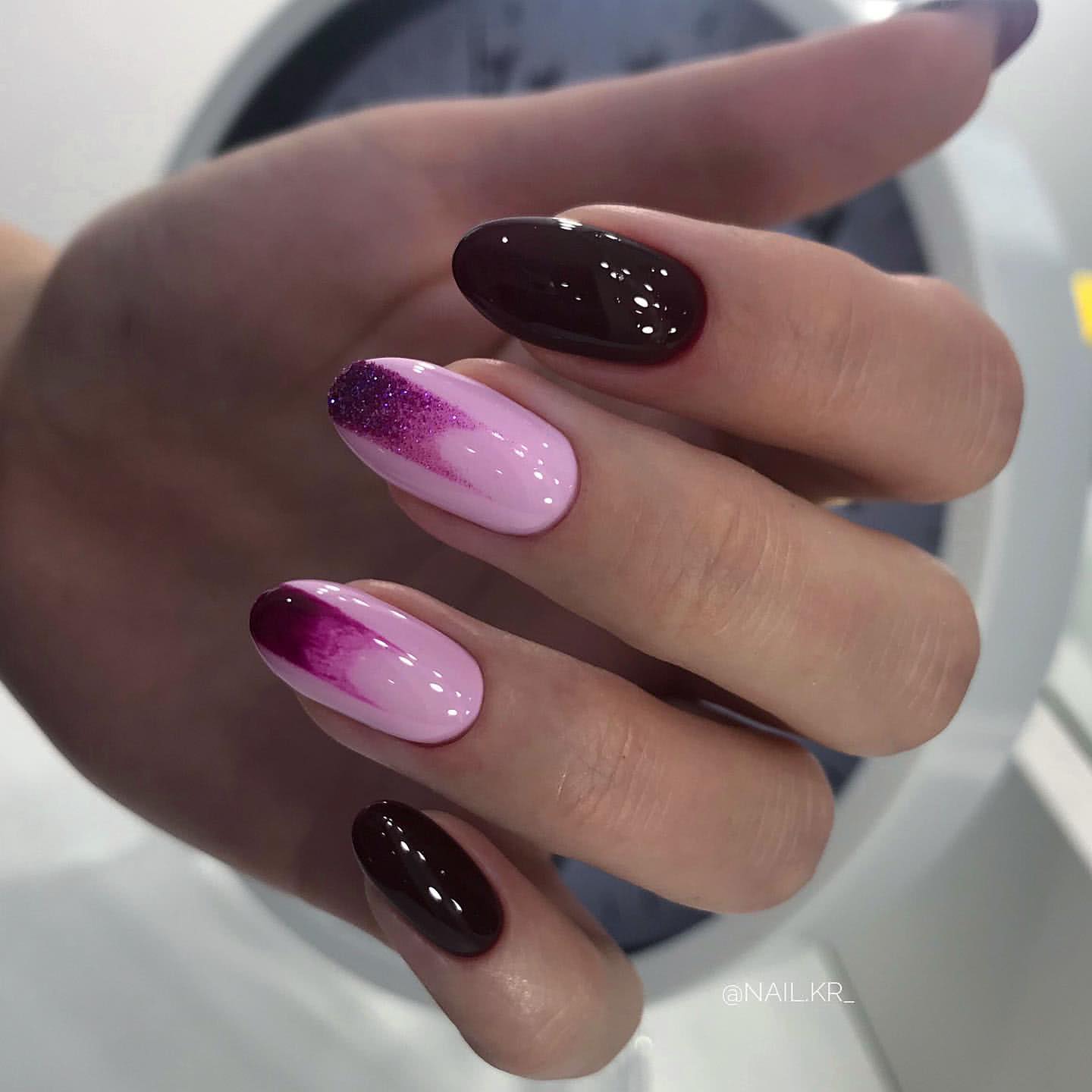 Интересный вариант — когда цвет меняется от мизинца на одной руке до мизинца на второй. Также такой маникюр можно сделать зеркальным: один и тот же оттенок повторяется на каждой руке на одном и том же пальце.