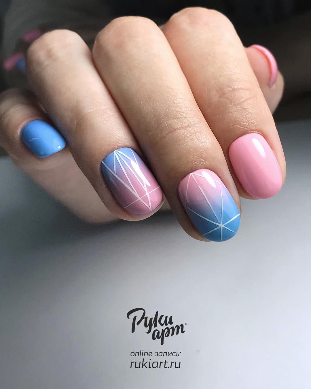 Соединив два актуальных тренда последних лет, можно получить стильное решение. Правда, техника нанесения будет совсем другая, более сложная — придется порисовать. Геометрические градиенты предполагают, что в один цветной гель-лак постепенно примешивается белый цвет, все более осветляя тон.
