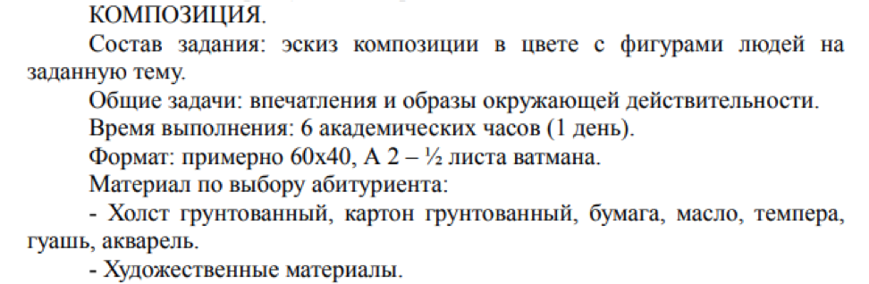 - портретная живопись (с руками): время написания – 12 часов; размер – до 80 см; материал – холст, масло или акварель (в зависимости от специальности, выбранной абитуриентом).