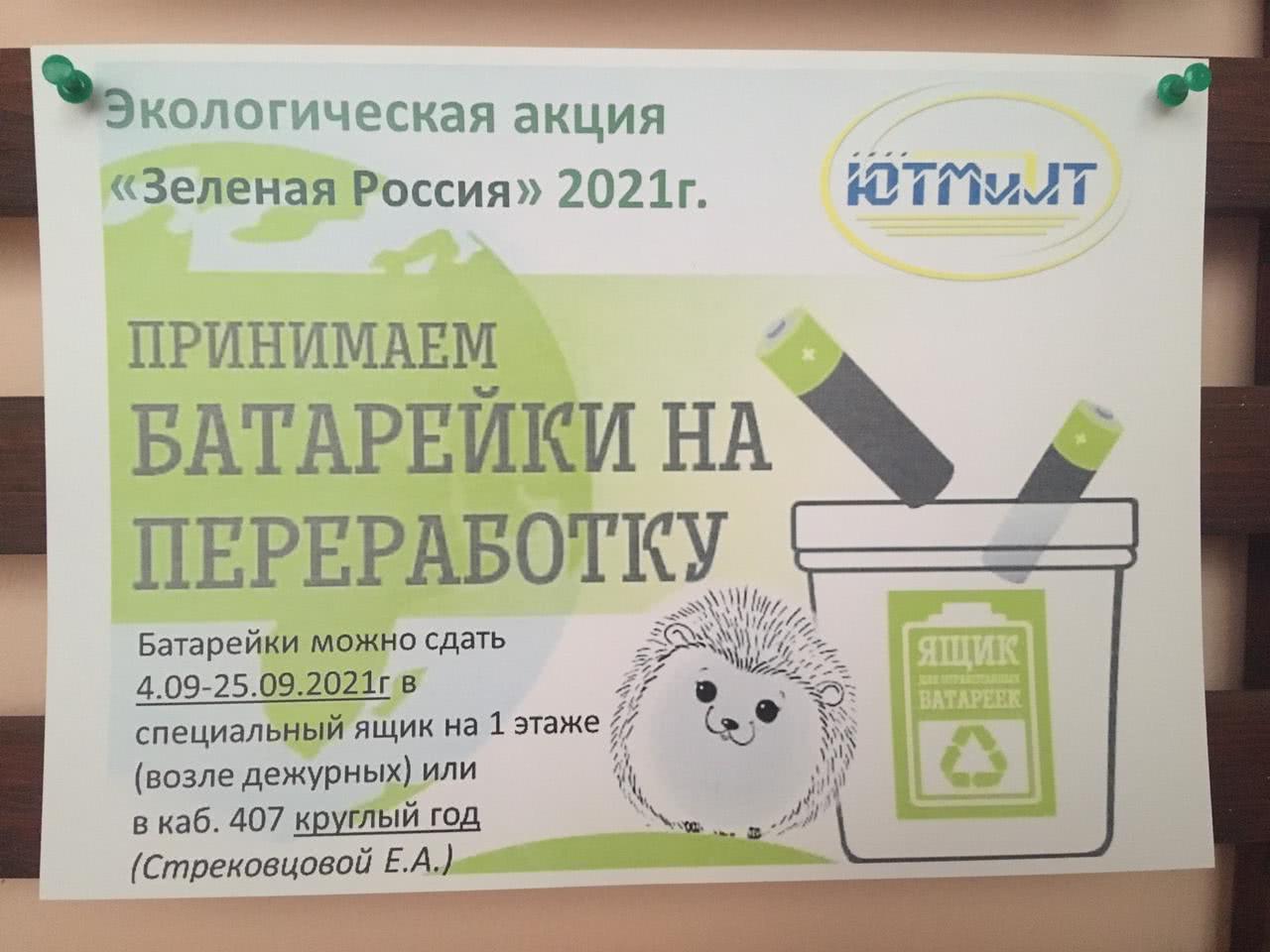 В рамках Всероссийской акции «Зелёная Россия» 4-25 сентября 2021 г. обучающие нашего техникума организовали сбор использованных батареек. Неравнодушные к сохранению природы студенты приносили отработавшие свой срок батарейки, собранные дома, у друзей и знакомых, и складывали в специально оборудованный ящик для сбора. Использованные батарейки — это опасные отходы, которые нельзя выбрасывать как обычный мусор. Собранные батарейки отправятся на утилизацию и не причинят вреда окружающей природе! Основная задача данного сбора — формирование экологического сознания, развитие экологической культуры, воспитание ответственного отношения ко всему живому на Земле.
