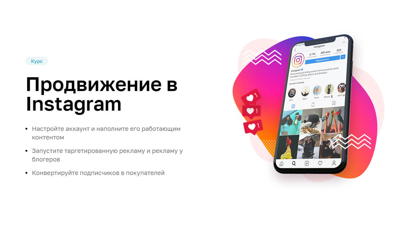 Курс состоит из 15 занятий длительностью 1 час. Здесь можно узнать азы по продвижению в Instagram: