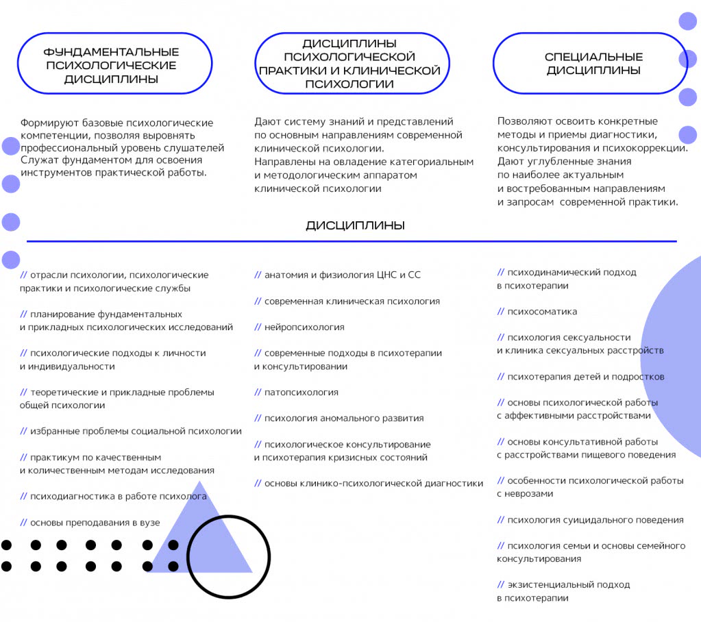 Структура программы позволяет сбалансировать фундаментальные знания в области клинической психологии и освоение широкого набора практических инструментов, методов диагностической, консультативной и психокоррекционной работы.
