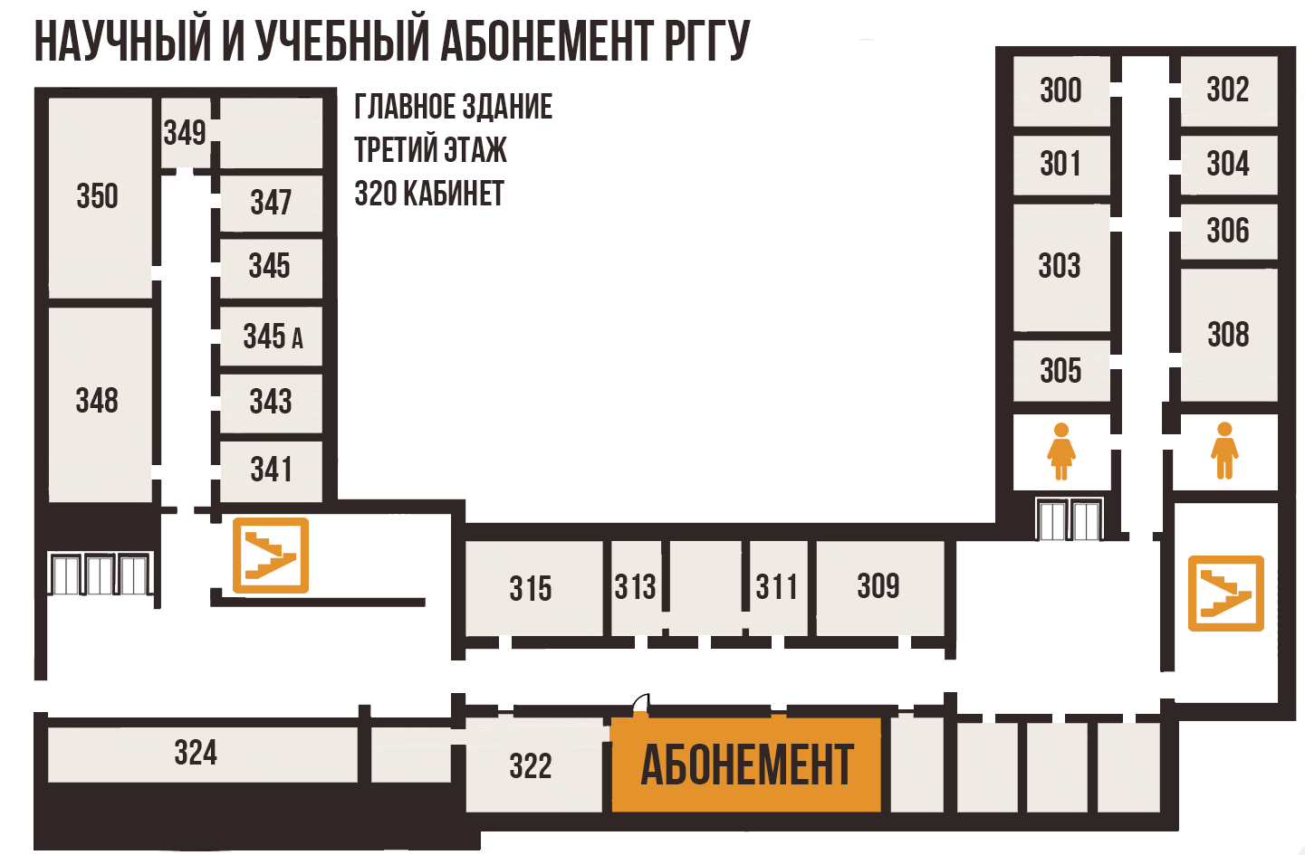 Абонемент РГГУ находится на третьем этаже главного корпуса, 320-й кабинет.