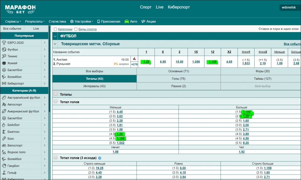 По системе “Танковая атака” ставки совершаются на события с коэффициентами “1.1-1.3”. Пример подходящих маркетов в росписи букмекера.