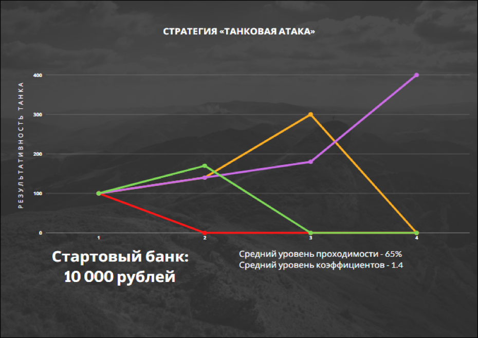 Риск проигрыша лесенки крайне высок, так как в данном случае важен не столько уровень проходимости, сколько возможность выигрывать сразу несколько ставок подряд. Добиться этого довольно сложно, тем более в нескольких «танках» одновременно. Чтобы получать доход на дистанции, необходимо либо создавать «длинные» изолированные потоки, повышая итоговую прибыль каждого из них, либо успешно закрывать не менее 50% «танков».