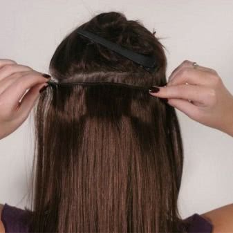 Разумеется, волосы нужно мыть и готовить полностью к этой процедуре, как указывалось выше. Там, где будут прикрепляться накладки из донорских волос, проведите круговой пробор. Все волосы поднимите наверх в пучке. Под линией пробора останутся лишь небольшие прядки, к каждой из которой заколками прикрепляют искусственные локоны по кругу. Виски делают объемными таким же способом, используя заколки и наборы волос. Осталось только опустить остальную шевелюру, прикрыв места закреплений. Метод простой, для того чтобы блеснуть на вечеринке новой прической, как раз подойдет. Приобрести потребуется 7-8 наборов с волосами различной длины. Заколки на ночь снимают, спать с ними нельзя. То есть это однодневное удлинение.