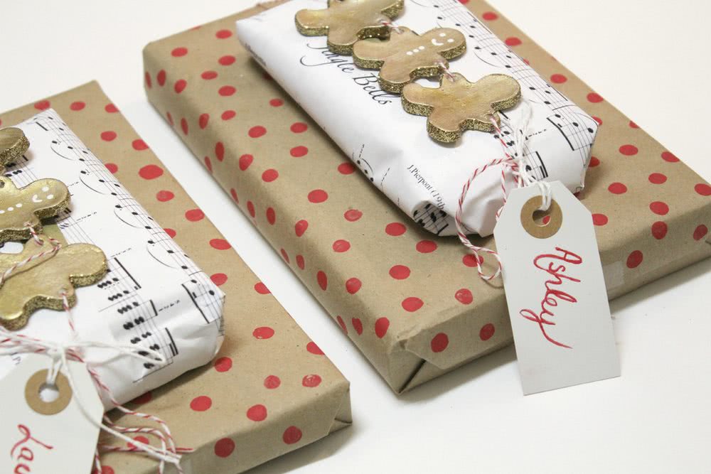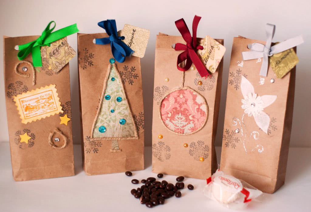 Распространенной идеей украшения подарков являются бирочки. На них можно написать пожелание, предсказание или изобразить рисунок. Создание этого элемента открывает множество разнообразных идей. Используя различную технику и свою фантазию, можно искусственно состарить бирку, сделать декупаж или вышивку.