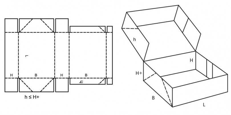 - Для ее изготовления понадобится картонный лист формата А4 или его половина. Деталь, из которой будет сформировано дно, должна быть по размеру на пол сантиметра уже по каждой стороне.