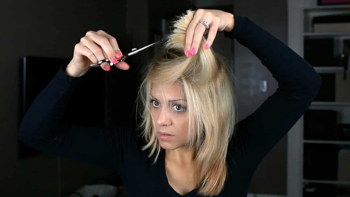 Перед тем как самому подстричь челку косую, профессионал разделяет волосы на несколько частей и выбирает пряди под нее. Здесь нужно использовать заколку или невидимки. Небольшой пучок волос он стрижет до необходимой длины.