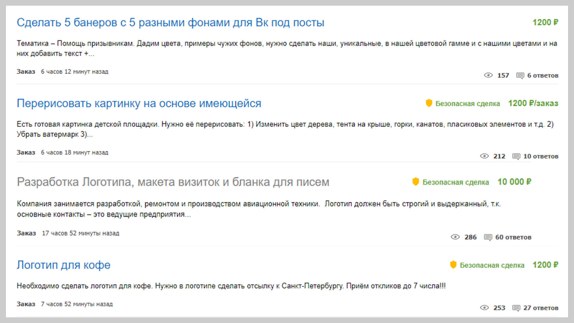 Как видно на скриншотах, можно сделать 5 баннеров для постов ВКонтакте и заработать на этом 1200 рублей (выходит по 240 р. за штуку), можно придумать лого для фирмы по продаже фиников и получить за заказ 1500 р. Есть и более дорогие предложения, например, создать логотип для компании занимающейся разработкой, ремонтом и производством авиационной техники, ценник за работу 10000 р.