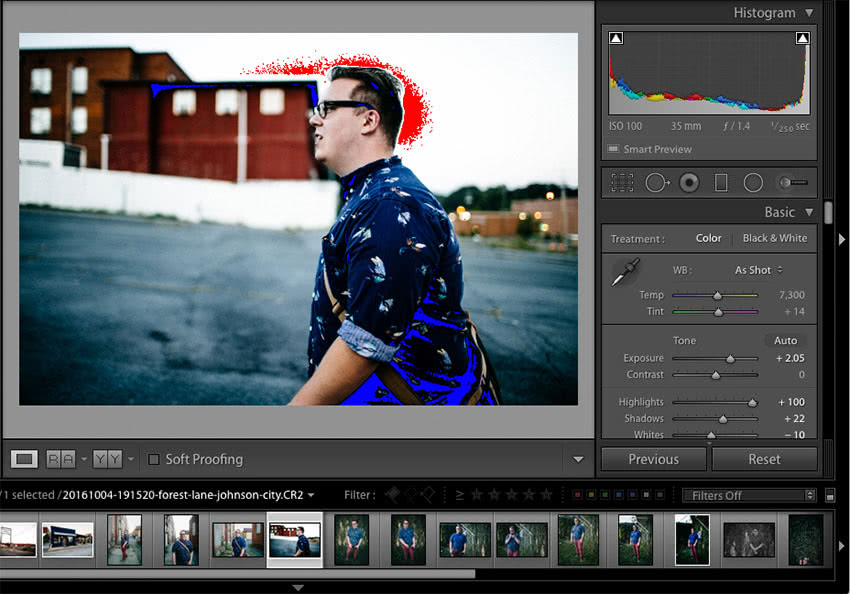 Красные участки показывают засвеченные места, а синие – потерю деталей в тени. Перетяните слайдеры назад в их диапазон, если хотите избежать неправильного экспонирования.