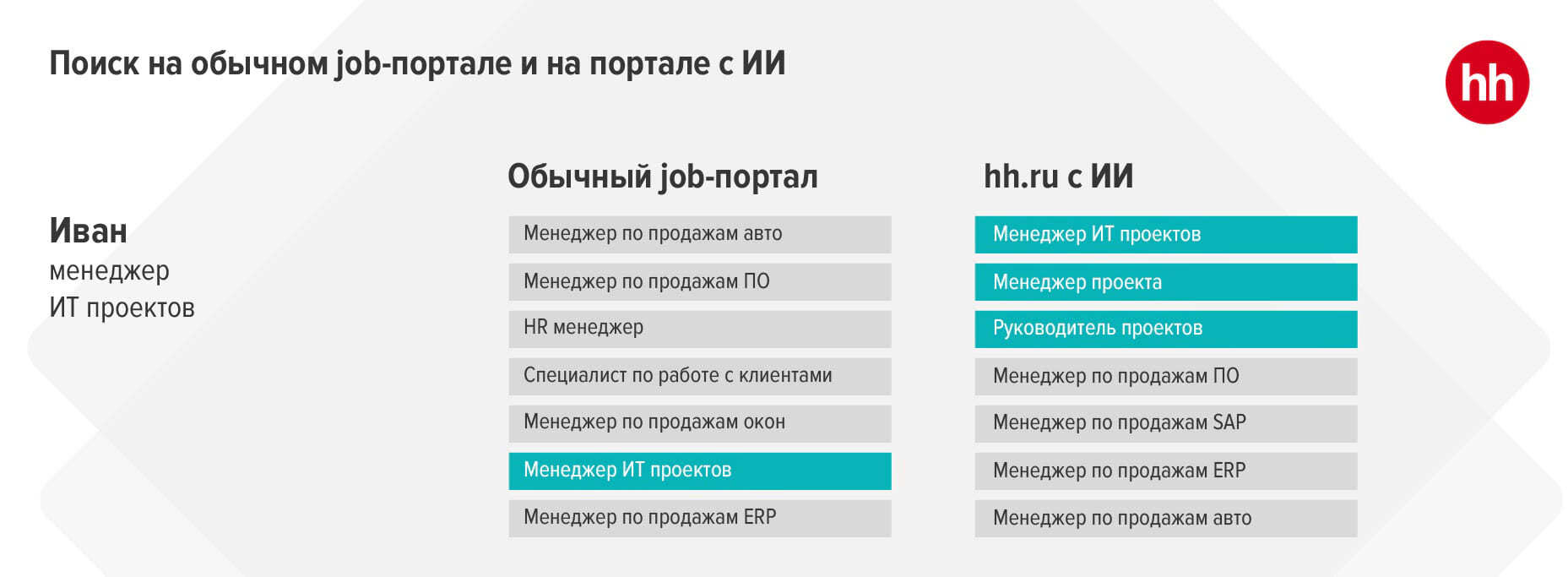 Важный нюанс: искусственный интеллект сравнивает не просто слова, а смысл. Он понимает, что, например, менеджер ИТ-проектов и Project manager — одно и то же, равно как HR-менеджер и специалист по подбору персонала, менеджер по продажам и специалист по работе с клиентами.