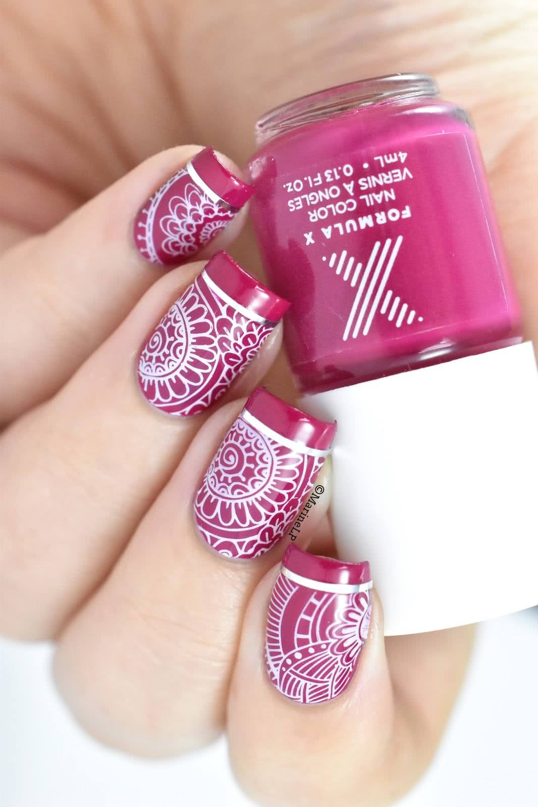 - Быстрым и точным движением снимаем трафарет и пару минут просушиваем слой в лампе. Для достижения более насыщенного оттенка повторяйте процедуру до получения желаемого результата, но помните, что каждый слой после нанесения необходимо просушить под лампой.