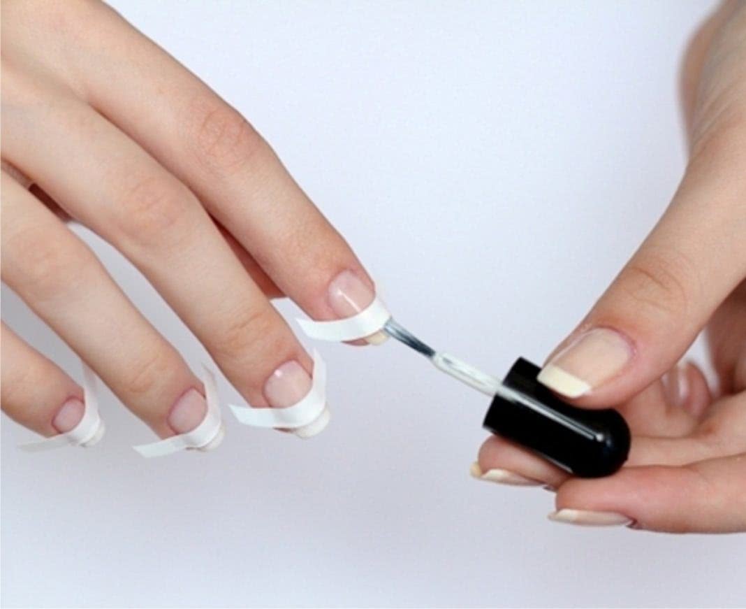 - Наклеиваем трафарет у основания ногтя и покрываем тонким слоем основную часть ногтя топовым цветом.