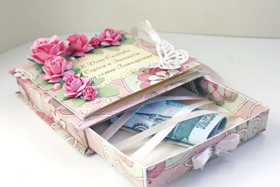Если говорить об отделке подобных изделий, то тут все зависит исключительно от вашей фантазии. Вы можете украсить коробочку для денежного подарка всем тем что есть у вас под рукой, либо же попробовать сделать цветы из бумаги для скрапбукинга. Как их можно смастерить вы можете увидеть немножко выше.
