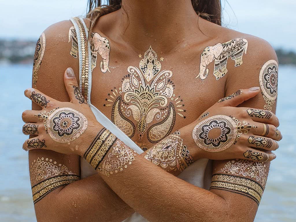 Флеш-тату (блестящие металлические татуировки) стали настоящим хитом прошлого сезона, и обещают не выйти из моды даже в следующем году. Ими модницы украшают свое тело не только на курортах, но и в городе. Существует огромное разнообразие форм, мест нанесения и сочетаний тату, что делает их весьма универсальными.