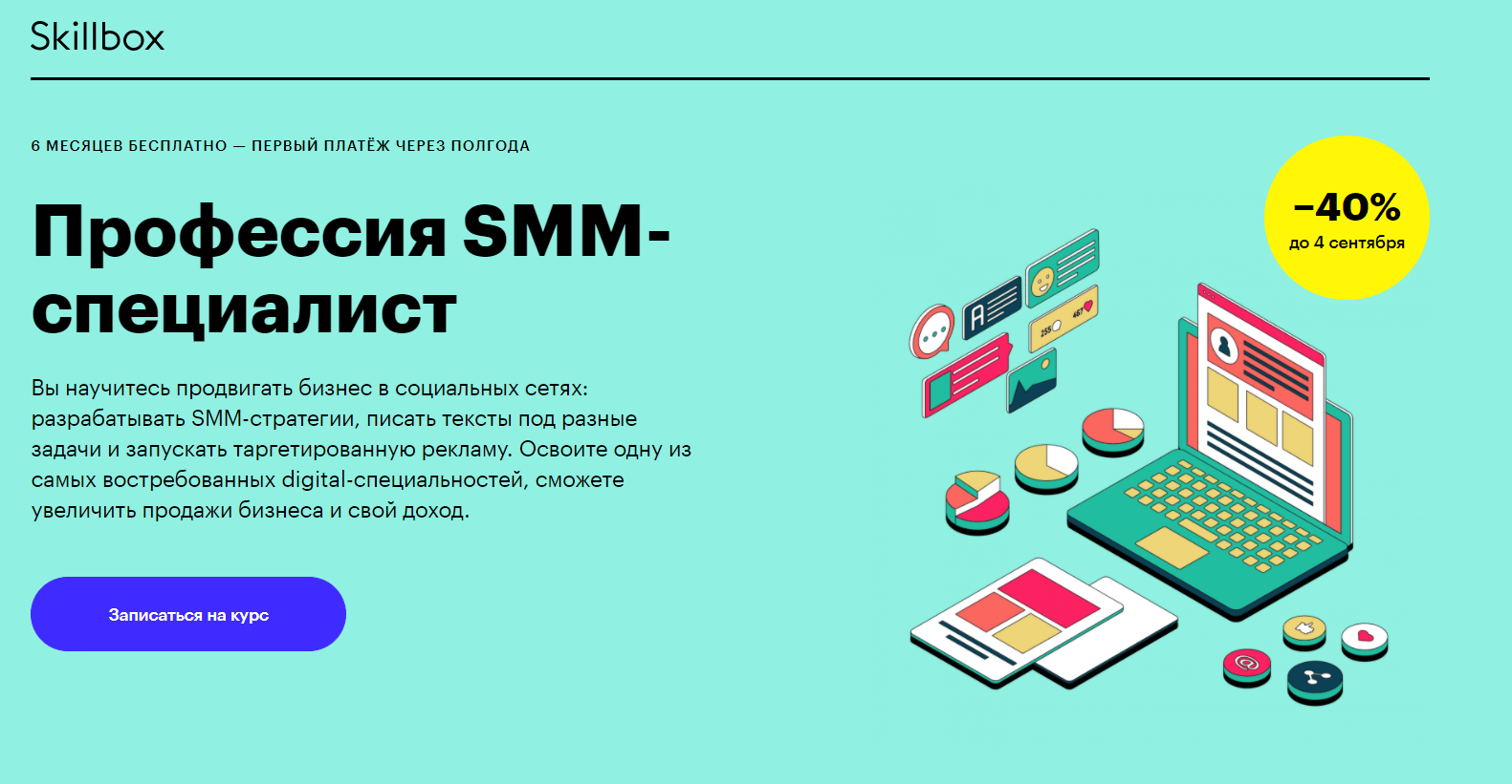 Курс от онлайн-университета Skillbox в рамках которого вы освоите востребованную профессию SMM-специалиста. Обучение проводится через практику.