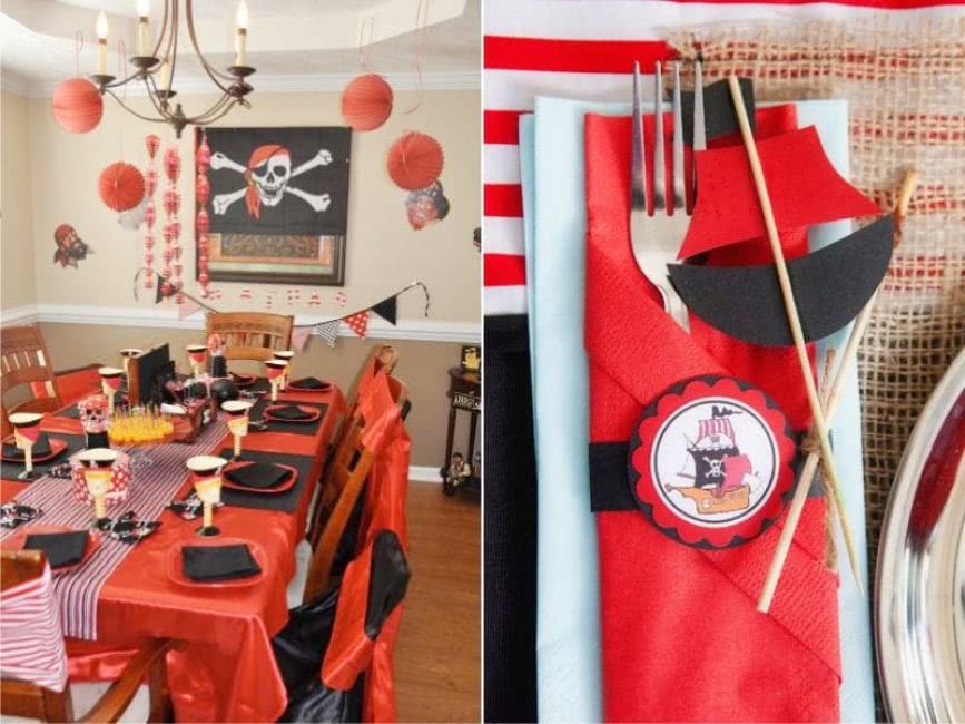 Праздник в стиле «Пиратов». Для этого варианта стол можно оформить, как пиратский корабль, гостей попросить прийти в костюмах, поставить графины с «ромом» (темным соком), спрятать «сокровища» на столе и пр.