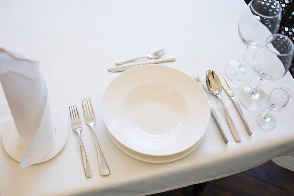 Тарелки необходимо ставить с промежутком в полметра. От края стола должен быть отступ не менее сантиметра.