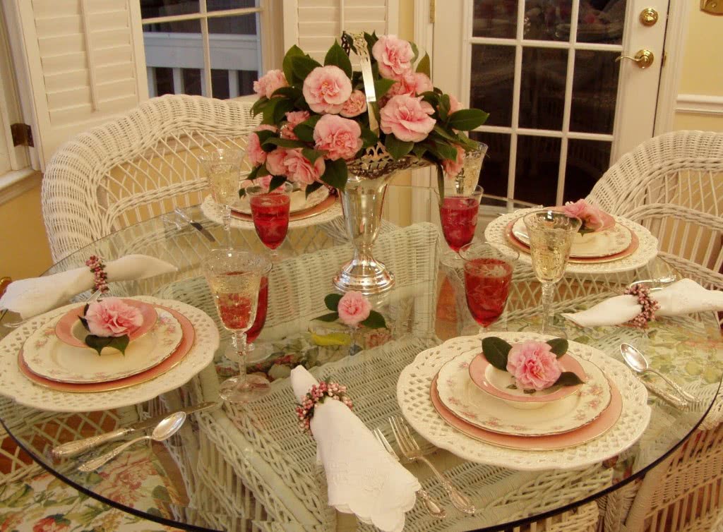 Праздничный стол можно декорировать живыми цветами. Красивую композицию располагают в вазе в центральной части стола. Необычное решение расстановка компактных корзиночек с цветами. Небольшие цветы можно положить у тарелок.