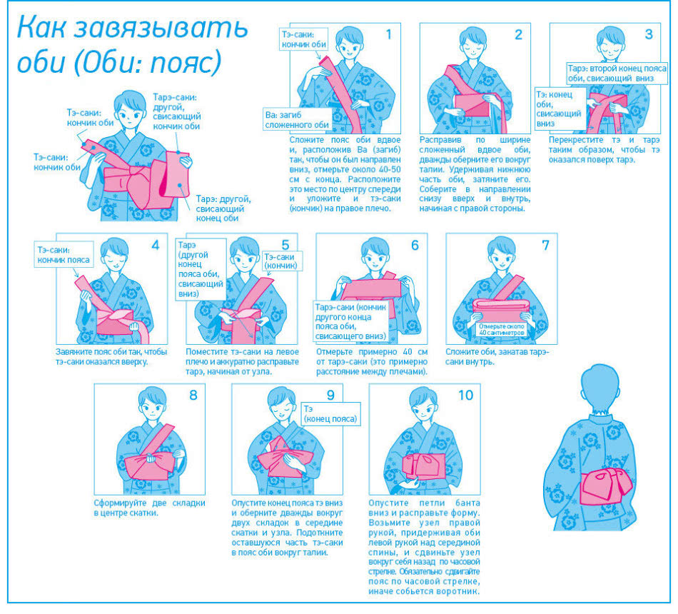 - Последний шаг – поворачиваем оби бантом назад. У нас это не столь известно, но в Японии бант спереди говорит о принадлежности женщины к особам легкого поведения.